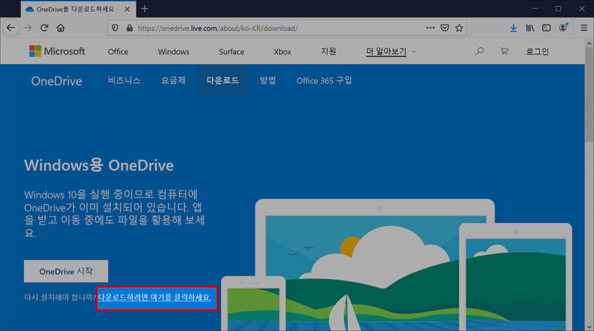 위에 화면에서 '다운로드 하려면 여기를 클릭하세요'를 눌러서 원드라이브 설치 파일을 실행하면 원드라이브 기능을 복구 할 수 있습니다.