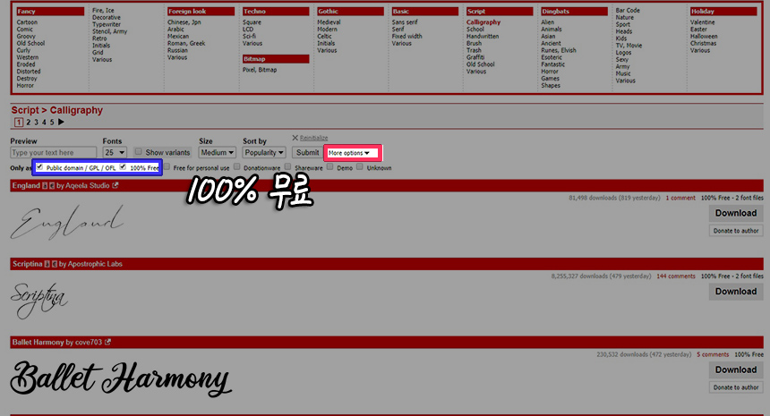 ์ฐธ๊ณ ๋ก ๋ผ์ด์ผ์ค ๋ฌด๋ฃ ์๋ฌธ ๊ธ๊ผด์ ์ฐพ์ ๋๋ DaFont์์ ์ํ๋ ์นดํ ๊ณ ๋ฆฌ ๋ณ๋ก ๋ณผ ๋ 'more options' ์ฒดํฌ๋ฐ์ค๋ฅผ ํ์ฑํ ํ ๋ค '100% Free'๋ฅผ ์ ํํ์๋ฉด ์ฝ๊ฒ ์ฐพ์๋ณผ ์ ์์ต๋๋ค. :)