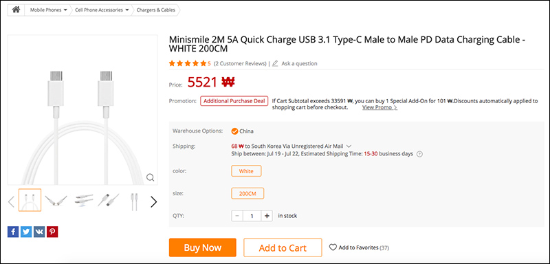 먼저 USB-C to USB-C 케이블입니다. 아직 한국에서 구입하면 비싼 제품이 많더군요. 다만 이 제품은 USB3.1이고, Type-C에서 Type-C로 나가는 케이블이라 앞으로 활용할 수 있느 분야가 참 많은 케이블입니다. 5521원 밖에 안하니 가격도 차가고, 배송료는 우편으로 68원만 더 내도 우편으로 날라오기에 꽤 메리트가 있습니다.