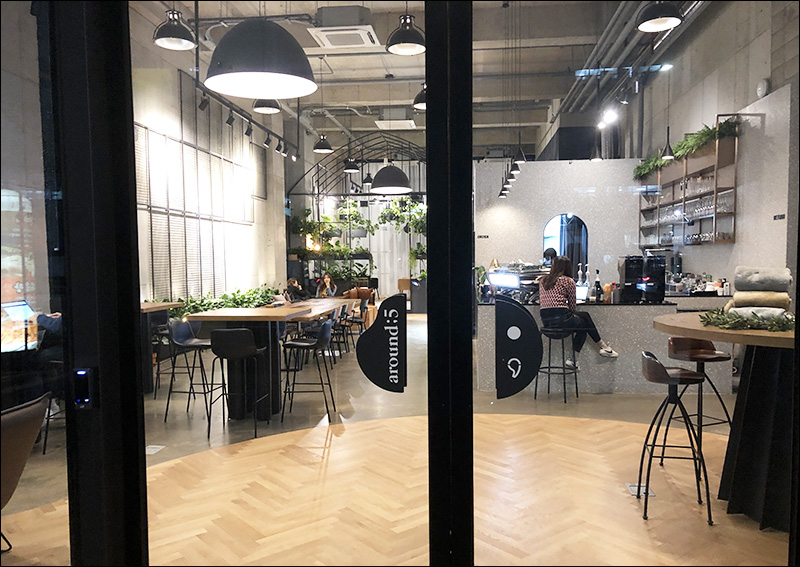 카페 Around Five가 1~2층을 사용하고 있고, 3층은 Patio 42라는 공간, 그리고 5층부터 패스트파이브 라운지가 시작되고 12층까지 오피스로 사용하는 것 같습니다. 13층은 루프탑 라운지라고 되어있네요.