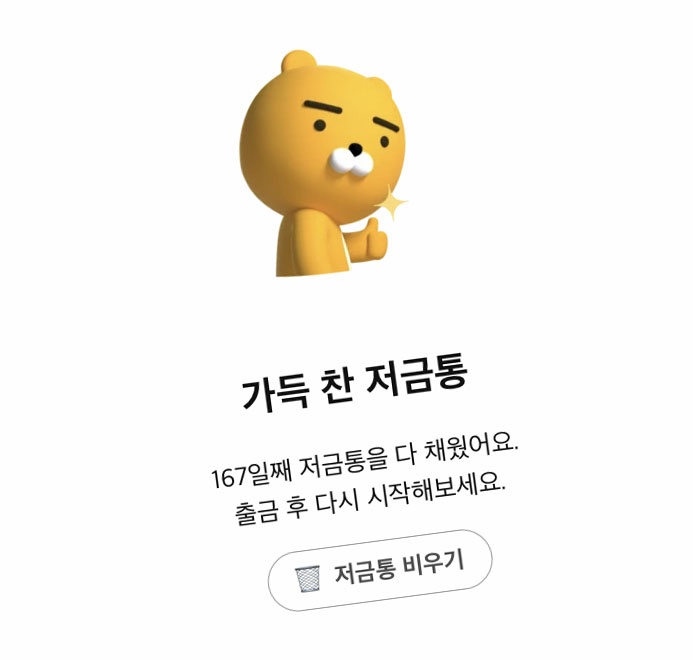 위와 같이 라이언이 엄지척을 하면서 167일째 저금통을 '가득 채웠다'라고 알려줍니다. 저금통 비우기를 누르니, 이자를 포함하여 10만원이 입출금통장 잔고로 입금되네요.