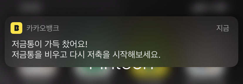 그렇게 카카오뱅크 저금통에 대해서 잊고 있을 때 쯤... 위와 같은 푸시 알림이 오더군요. '저금통이 가득찼어요!'라는...