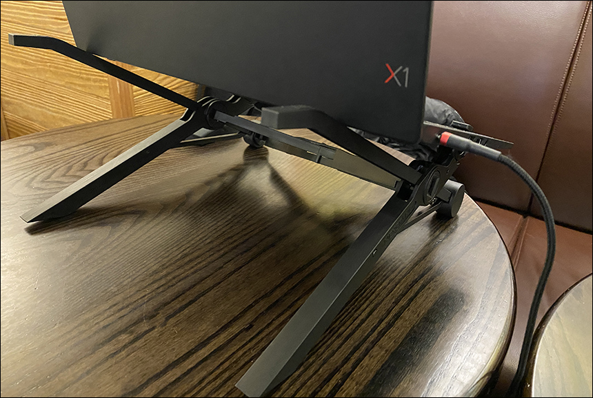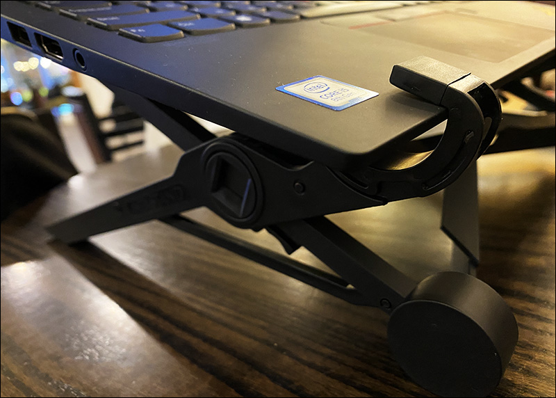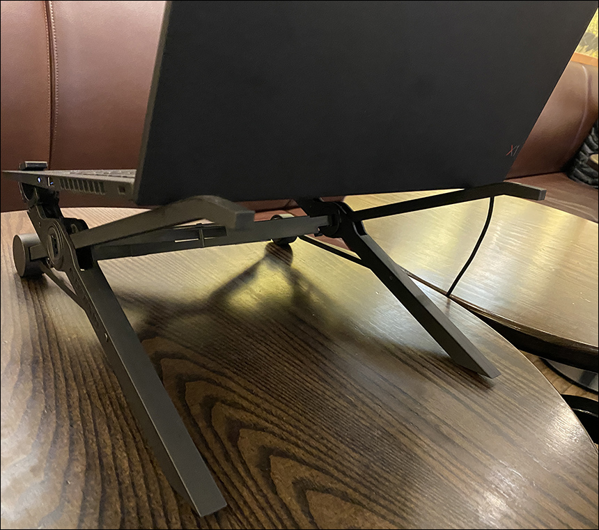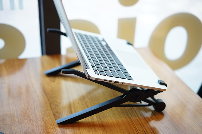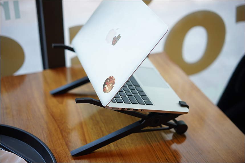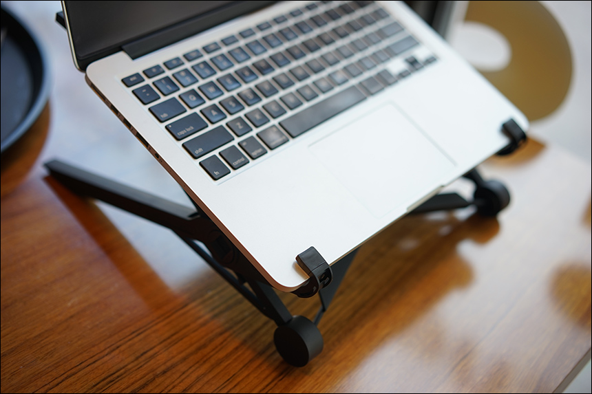 위와 같이 바닥에서 살짝 뜬 상태로 거치가 가능한 모델입니다. 각도를 높일 수록 노트북을 허공(?)에 뜨게 되어 있죠. 고리처럼 되어 있는 부분이 있어서 노트북을 꽉 잡아주긴 합니다. 주의해야 할 점은 스크린을 닫을 때 걸리기 때문에 꼭 노트북을 먼저 내려놓고 화면을 닫는 것이 좋겠요 ^^