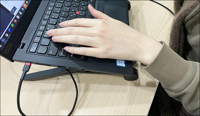 노트북 스탠드가 살짝 높이를 올려주기에 자판을 타이핑 할 때는 위와 같이 손이 위치 됩니다. 각도를 최고로 올려서 쓴다면 무선 키보드와 무선 마우스를 같이 활용해보는 것이 좋겠네요.