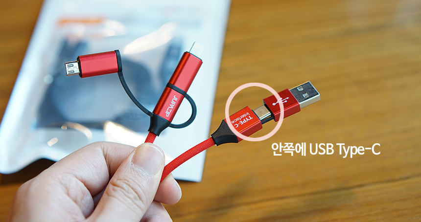 사진에 보이는 것처럼 기본은 USB-C 케이블이지만, 어댑터를 끼우면 microUSB 5핀, 또는 애플 라이트닝 8핀으로 변경이 됩니다.