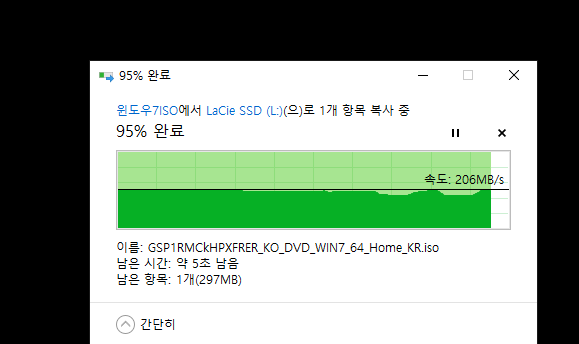 속도가 끝내주네요. 최대 5Gbps를 지원합니다. 일반 HDD에서 SSD로 복사를 했기에 풀 스피드가 나오지 않았는데요. SSD에서 SSD로 복사를 하면 초당 450MB/s가 나올때도 있더군요. ^^