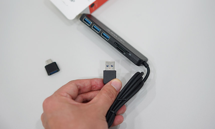 20CM와 120CM 케이블 길이을 고를 수 있습니다. 노트북 PC에 사용할 때는 주로 바로 옆에 꽂아서 사용하는 경우가 많으니 20CM가 적합해 보이네요. 그리고 허브 자체의 연결 포트는 기존 USB-A 포트인데, USB-C 어댑터를 골라 구입할 수 있습니다.