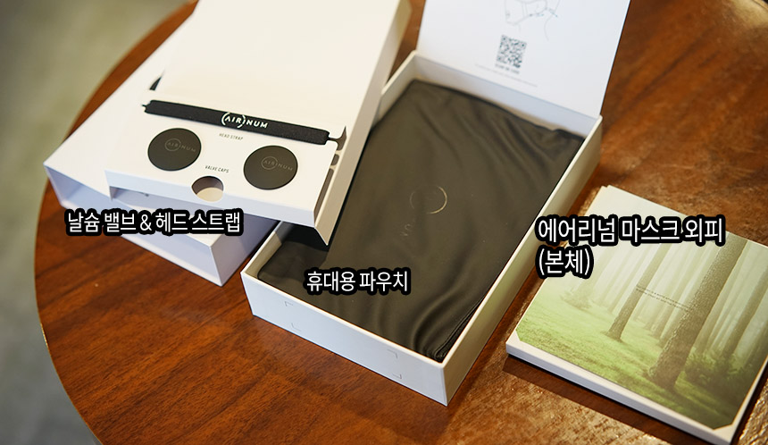 제품을 개봉해 보면 바로 먼저 보니는 것이 날숨을 할 때 내부 공기를 밖으로 효과적으로 배출해주는 기능을 가진 밸브 커버가 보입니다. 그리고 보통 잘 사용은 하지 않지만, 목에 걸고 다닐 수 있는 스트랩이 들어있죠.