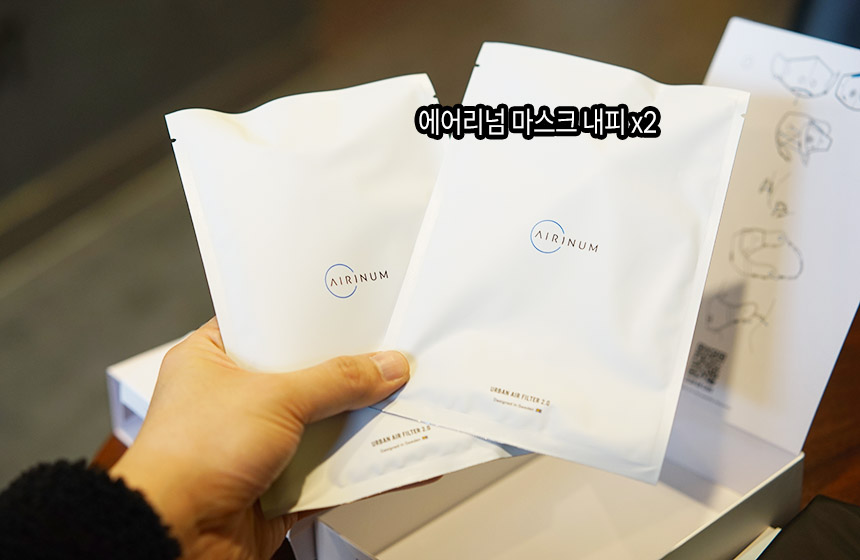 조금 더 안쪽에는 에어리넘 마스크 내피 2장이 들어 있습니다. 하나만 개봉해서 사용하면 되고, 개당 사용 권장 일수는 15일(보름) 입니다. 즉 한번 구입하면 일단 1달 동안은 사용이 가능합니다.