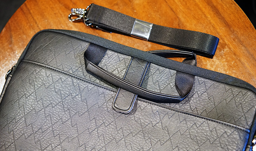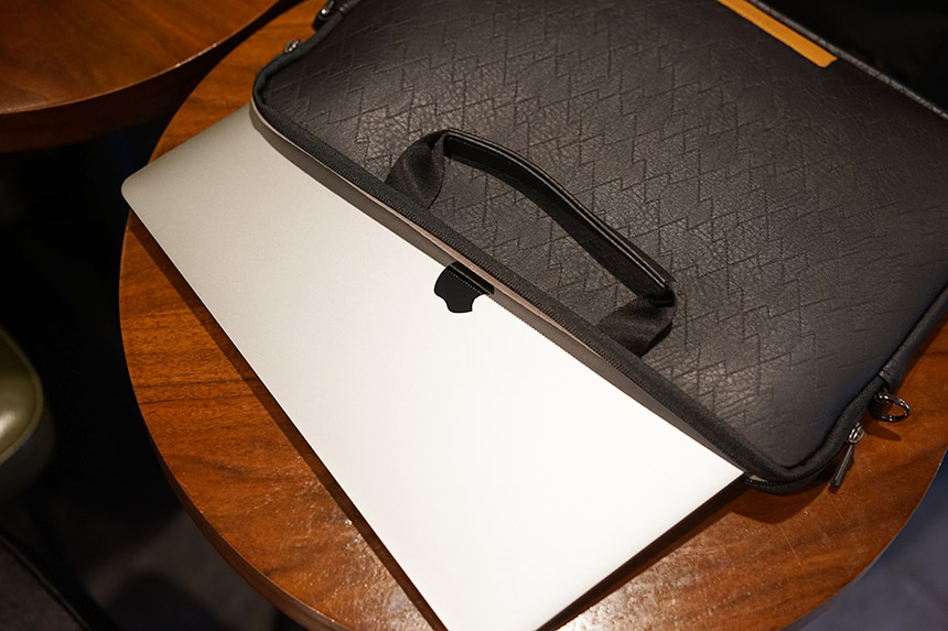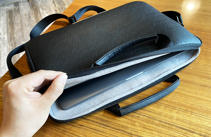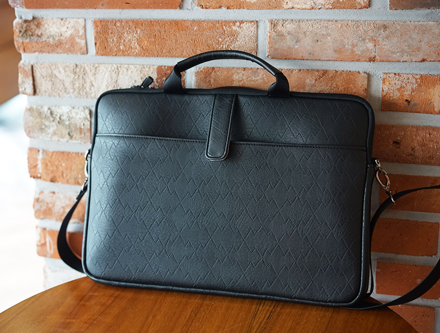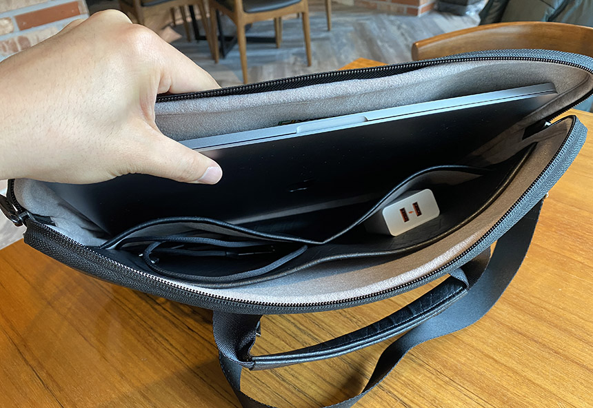 뒷쪽에도 얇은 물건을 넣을 수 있는 수납공간이 있습니다. 펜이나 노트, 명함 등 회의를 끝내고 후다닥 나오기 위해 이것저것을 적재하기에 안성맞춤이더군요. 디테일 컷을 아래에서 살펴보고, 가장 중요한 노트북을 한번 넣어볼까요?
