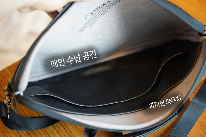 안쪽은 센스있게 노트북이 들어가는 메인 수납공간, 그리고 파티션이 나누어져 있습니다. 메인 공간 이외에도 총 3개의 얇은 파티션 포켓이 있다고 생각하시면 됩니다.