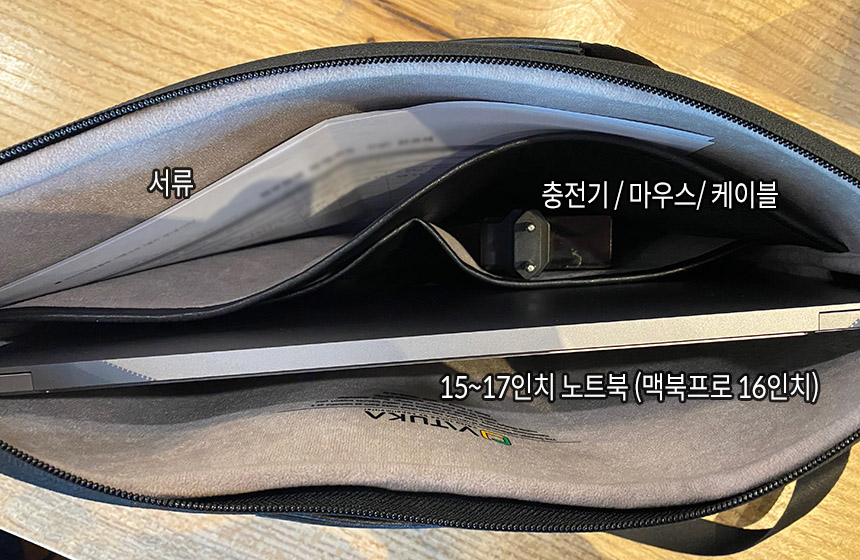 소중한 맥북프로 16인치 노트북을 안전하게 보관하고 휴대할 수 있다는 점 때문에 백팩보다 매우 유용하게 사용하는 것 같습니다. 아무래도 스크린 크기가 큰 15~17인치 노트북으로 갈 수록, 백팩보다는 이런 서류가방 형태의 노트북 가방이 더 실용적으로 느껴지는 것 같아요.
