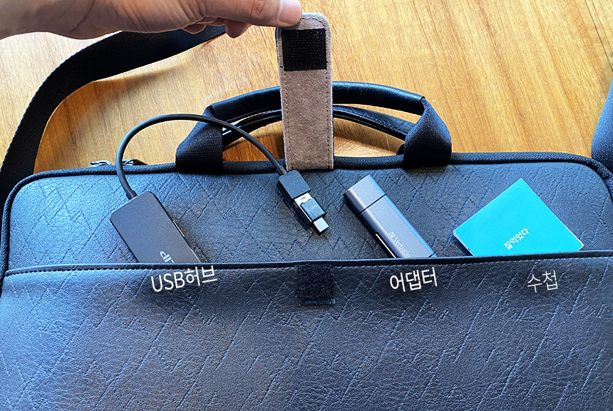 자 그럼 이제 실용적인 부분들을 살펴볼 차례인데요. 외부 파우치에는 USB허브/어댑터 젠더, 얇은 수첩 등 다양한 물품을 빠르게 넣고 꺼낼 수 있어 좋습니다. 벨크로로 고정을 할 수 있어서 좋구요. 보통은 이곳에 서류를 넣기에 안성맞충이더군요. 제 경우에는 얇은 공책형 다이어리와 펜을 넣고 다니다가 항상 꺼내서 회의 때 사용하곤 하였습니다.