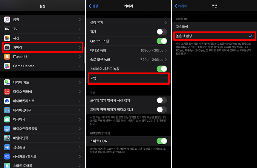 어찌되었든, 아직은 HEIC파일들이 익숙치 않기에, 아이폰에서 사진을 찍을 때, 되도록 '고효율성(HEIC)' 보다는 기존 이미지 파일로 널리 사용되는 'JPG로 저장'하는 것이 좋겠죠? 위와 같이 아이폰 설정에서 '높은 호환성'으로 해두면, 사진이 JPG로 찍히게 됩니다. :)
