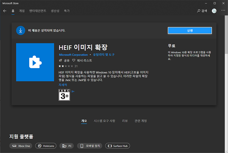 위와 같은 방법도 좋지만 가장 편한 것은 일단 윈도우10에서 HEIC파일을 열 수 있는 것이겠죠. 윈도우10에서 해당 파일을 열려면 아래의 HEIF 이미지 확장, HEVC Video Extensions을 윈도우 스토어에서 다운로드 해서 설치하면 됩니다. :)