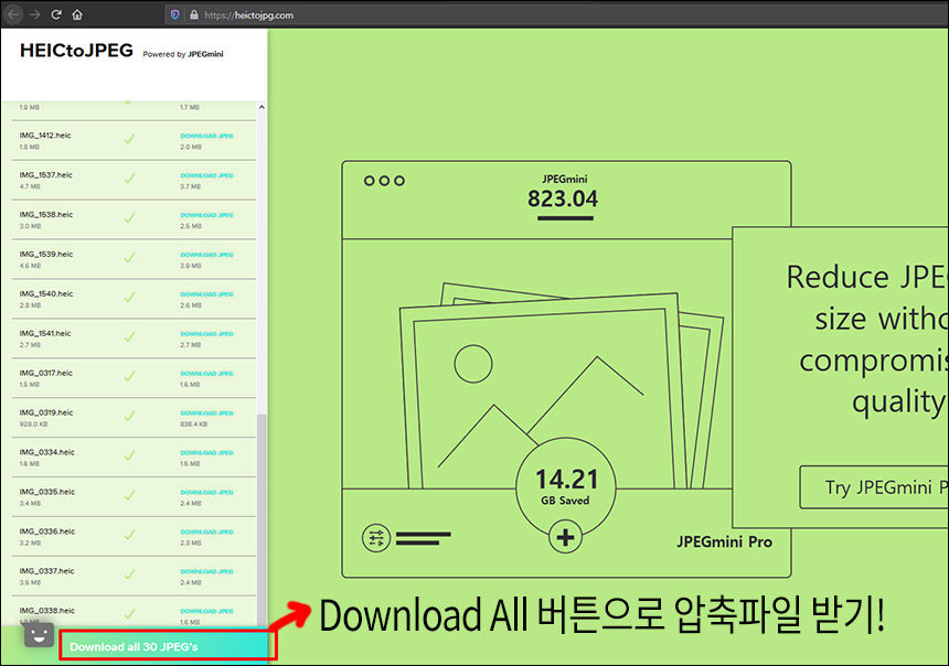 가장 유명한 웹 변환 유틸이 heictojpg.com 이 있습니다. 여러장을 간단하게 드래그앤드롭으로 HEIC 이미지파일들을 변환할 수 있고 매우 빠르게 Heic파일이 JPG로 변환되더군요. 30개까지 한번에 올려서 테스트 해봤는데, 압축파일로 다운로드 받을 수 있어서 많은 유저들이 사용하고 있는 것 같습니다.