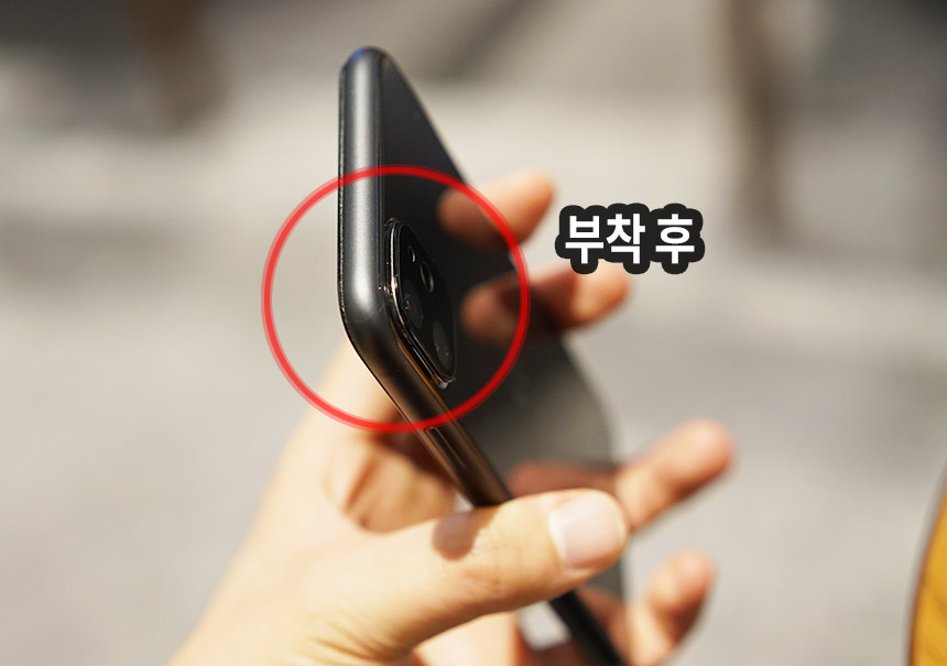 부착한 후에 모습입니다. 케이스를 사용하지 않는 분도 카메라 부분을 확실하게 보호해줄 수 있어서 좋네요. 딱 카메라 부분만 보호되도록 되어 있지만, 두꺼운 케이스를 사용하시는 분이라면 일단 케이스 호환성을 잘 알아보시기 바랍니다. 같은 주파집 브랜드 케이스를 사용하고 있기에 케이스를 씌워도 카메라 강화유리 때문에 장착할 수 없지는 않았어요. ^^