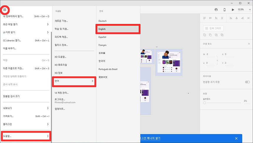 ์ ์ผ ์๋์ชฝ์ ์๋ ๋์๋ง(Help) ํญ๋ชฉ์์ ์ธ์ด -> English๋ก ์ค์ ์ ํ ๋ค, ์ฑ์ ๋ค์ ์คํํ๋ฉด ์์ด๋ก Adobe XD๋ฅผ ์ฌ์ฉํ ์ ์์ต๋๋ค. ์ ์ด๋ฐ ์ค์ ๊ธฐ๋ฅ์ด ๋์๋ง ๋ฉ๋ด์ ๋ค์ด๊ฐ ์๋์ง๋ ๋ฏธ์คํ ๋ฆฌ... :)