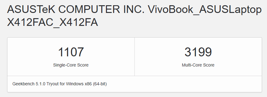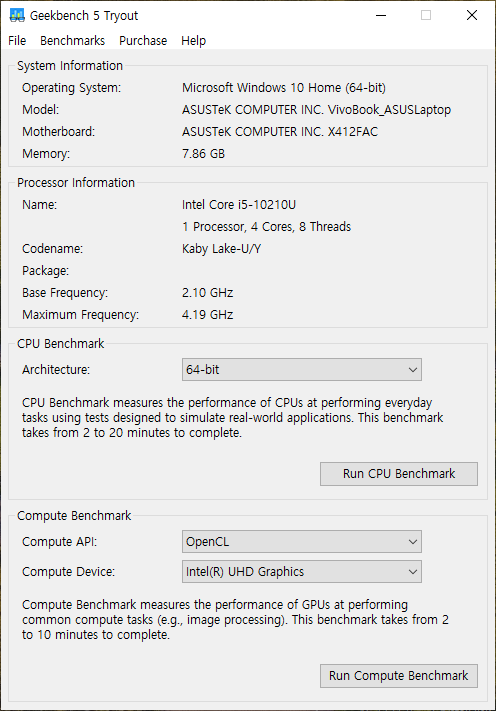 인텔 10세대 i5-10210U, DDR4 램 8GB, 256GB NVME SSD를 탑재한 모델입니다. 가장 먼저 성능지표를 알아보기 위해 긱벤치4(Geekbench)를 돌려봤습니다.