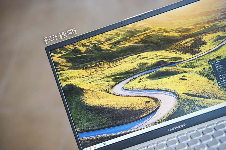 ASUS 비보북 X412에 전원을 넣고 사용하면서 감탄하게 되는 부분은 깨끗한 디스플레이 퀄리티 입니다. 광시야각 IPS 패널, FHD(1920x1080) 해상도로 쨍한 화면을 볼 수 있고, 배젤이 약 5.7mm 밖에 되지 않아 몰입도가 높은 넓은 화면을 만끽할 수 있죠.