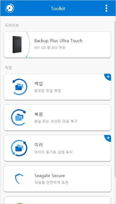 지원 소프트웨어는 Seagate Toolkit인데요. 설치해서 실행해보면, 백업이나 미러링(데이터 복제), 그리고 백업 한 뒤에 복원하는 기능, 그리고 데이터를 암호화 하는 Seagate Secure 같은 기능들을 활용해볼 수 있습니다.