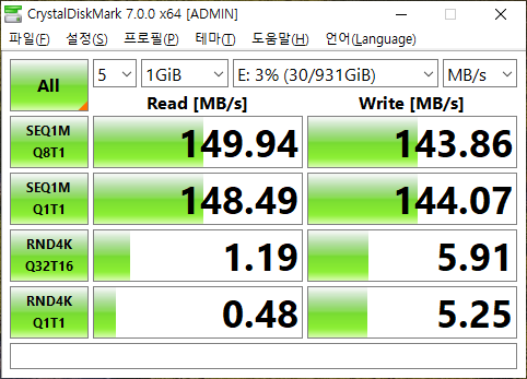 위와 같이 CrystalDiskMark 점수는 최대 읽기속도 149.94MB/s, 쓰기 속도는 143.86MB/s입니다.