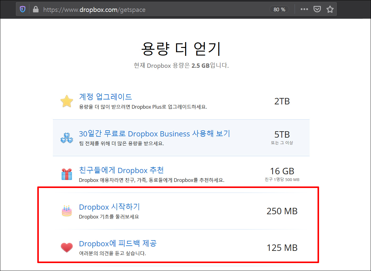 ๋๋กญ๋ฐ์ค ๊ธฐ๋ณธ ์ฉ๋์ 2GB์ด์ง๋ง, ์น๊ตฌ ์ถ์ฒ์ผ๋ก ๊ฐ์ ์ ํ์๋ฉด 2.5GB, ์ฆ 500MB ํน์ ๋ณด๋์ค ์ฉ๋์ ์ฝ๊ฒ ๋๋ ค ์ฌ์ฉํ ์ ์์ต๋๋ค.