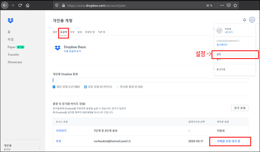 ์น๊ตฌ ์ด๋ ๋ณด๋์ค 500MB๋ ๊ฐ์ ํ ์ด๋ฉ์ผ์ ์ธ์ฆํ๋ ์๊ฐ ๋์ด๋ฉ๋๋ค. ์กฐ๊ธ ๋ ์์ธํ ์ดํด๋ณด๊ธฐ ์ํด ๋๋กญ๋ฐ์ค์ ๋ก๊ทธ์ธ๋ ์ํ๋ก dropbox.com/account/plan๋ก ์ ์ํด๋ณด์๋ฉด...