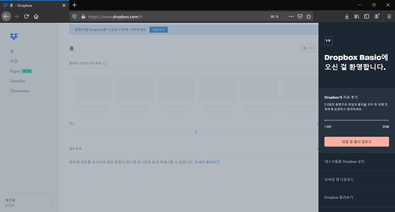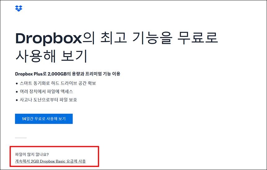 ๊ฐ์ ์ ์๋ฃํ๋ฉด, Dropbox Plus๋ผ๋ ์ ๋ฃ ๋ชจ๋ธ์ ๊ถ์ ํฉ๋๋ค. ๊ทธ๋ฅ ์ฟจํ๊ฒ ๋ฌด๋ฃ๋ฒ์ ์ ์จ๋ ์ด๊ธฐ์๋ ํฐ ๋ฌธ์ ๊ฐ ์์ต๋๋ค. ๋ฐ์ ์กฐ๊ธ ๋ด๋ ค๊ฐ๋ณด๋ฉด '๊ณ์ํด์ Dropbox Basic ์๊ธ์ ์ฌ์ฉ...'์ ํด๋ฆญํ์๋ฉด ๋ฉ๋๋ค. ^^