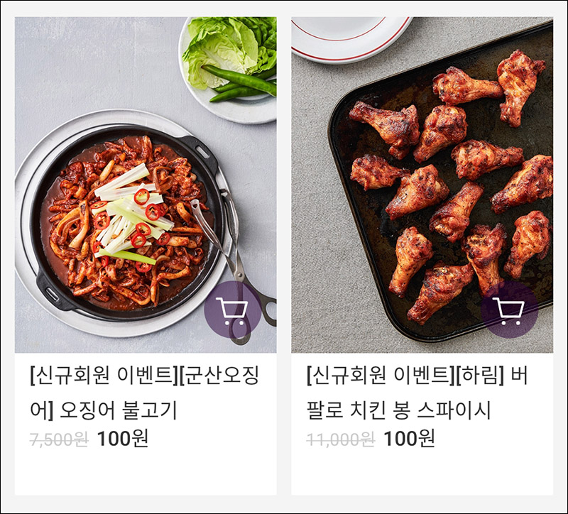 저는 신규회원 이벤트로 구입할 수 있는 100원짜리 상품 중, 밥과 함께 먹으면 좋을 것 같은 군산오징어 불고기를 선택했습니다. 그리고 한돈 떡갈비외할머니떡 차돌 된장찌개등을 두루 담아서 주문했네요 ^^
