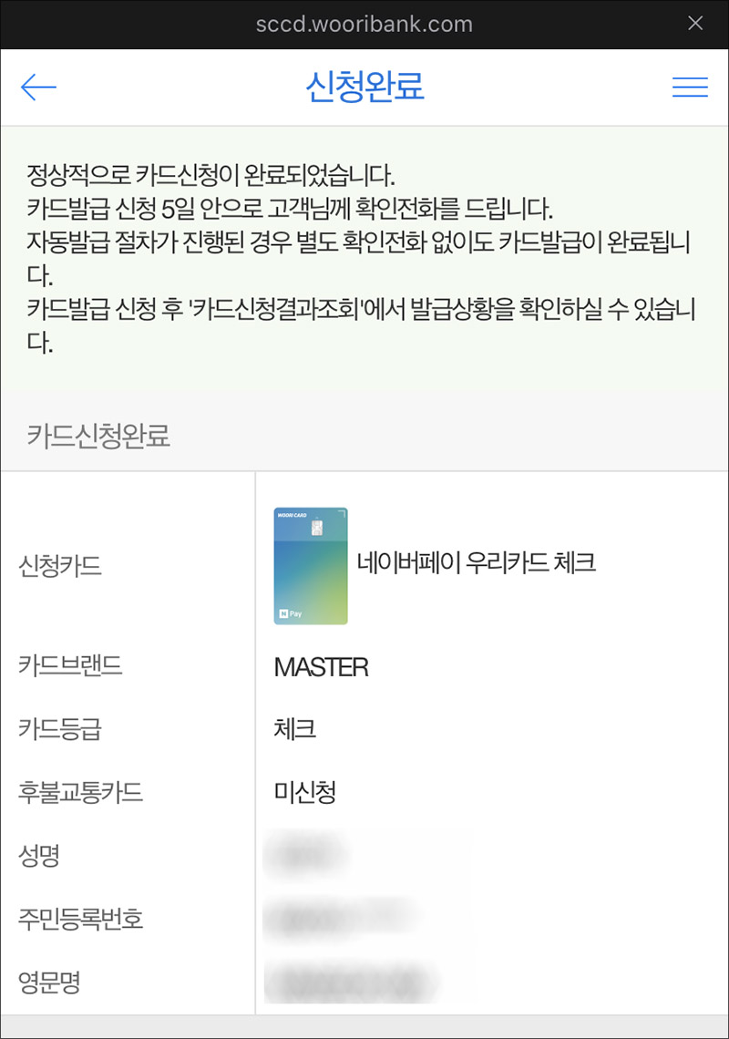 네이버페이 우리체크카드를 받고 실물을 받게 되면 한번 포스팅을 업데이트 해보도록 하겠습니다. :)