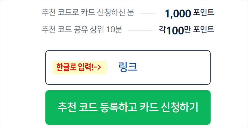 필요하신 분들은 위에 링크를 통해 가입해보세요, 그러면 아래처처럼 추천 코드로 카드 신청한 분으로 인정되어 1000원 (네이버페이 포인트)를 추가로 적립받을 수 있습니다.