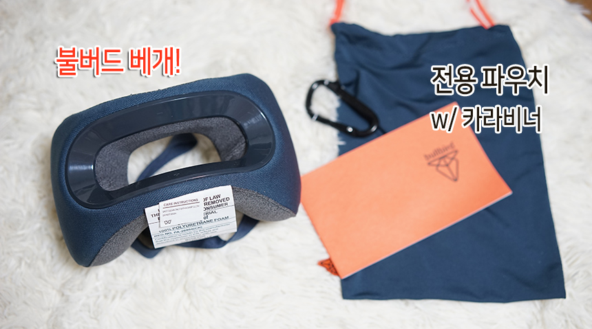 위와 같이 전용 파우치 + 카라비너, 그리고 메뉴얼이 들어있습니다. 불버드 BR2 목베개는 중앙이 뚫여있고, 미니멀한 디자인이 포인트 입니다. 조금 더 자세하게 살펴볼까요?