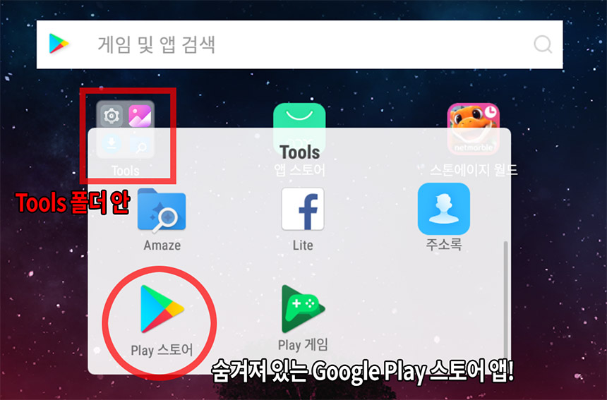 구글 계정 연결 및 설정을 완료되면 아래와 같이 어플을 다운로드 할 수 있고 실행까지 가능합니다. 혹시라도 앱 검색이 잘 안되다면 구글 플레이 스토어 앱을 아래와 같이 Tools 폴더에서 찾아 수동으로 다시 한번 재실행하여 검색을 해보세요 ^^