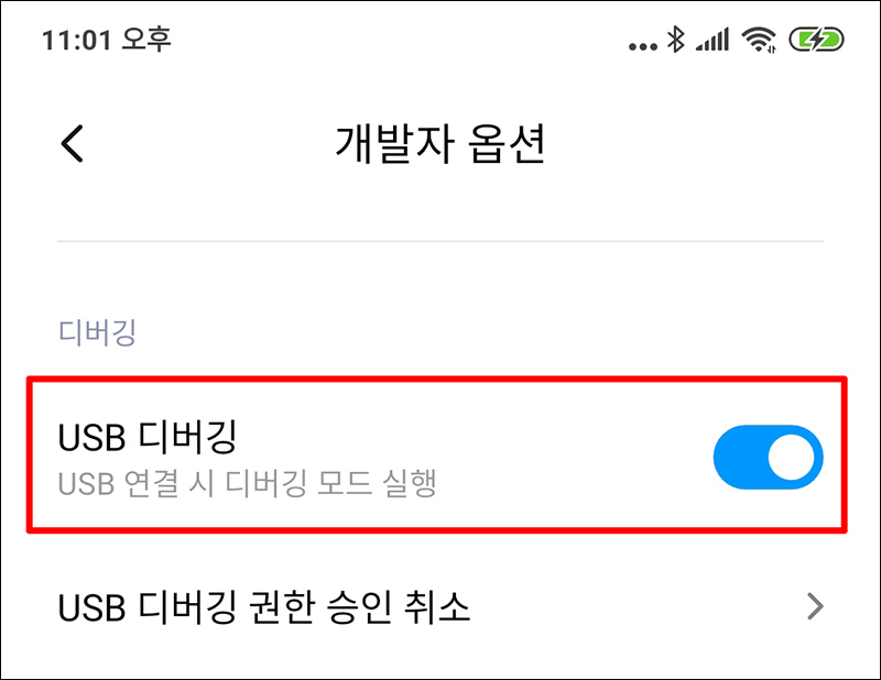 만약 첫 실행시 USB 디버깅 모드와 관련된 안내가 나온다면 안드로이드 스마트폰의 '개발자 모드(옵션)'에서 'USB 디버깅'기능을 활성화 하지 않았기 때문인데요.