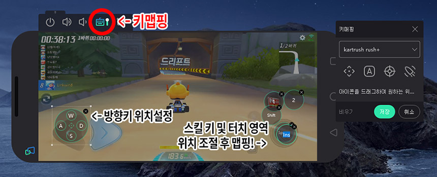 키매핑 버튼을 눌러서 WASD 방향키를 가상키패드로 설정하고, 숫자기나 별도의 임의 키를 맵핑해서 해당 영역을 터치한 것처럼 설정이 가능합니다. 카트라이더 러쉬플러스는 모바일 게임이지만, 미러로이드 키맵핑 기능을 통해 키 몇개만 잘 세팅해두면 얼마든지 PC게임처럼 놀 수 있더군요. ^^ 잘만 세팅하면 핵앤슬래쉬 모바일 MMORPG도 문제 없습니다.