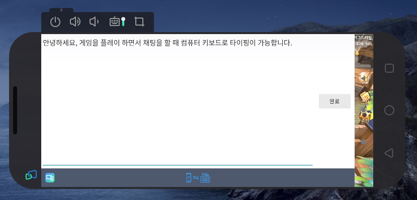 MirroidInput 앱을 USB로 설치한 경우 타이핑 환경도 매우 편리해지는데요. 모바일 카톡에서 바로 키보드로 글을 쳐서 전송할 수 있고, 무엇보다도 게임을 플레이 하다가 채팅창을 이용해야 한다면 컴퓨터 키보드로 바로 글을 쓸 수 있어서 편합니다. 속도도 매우매우 빠르구요.
