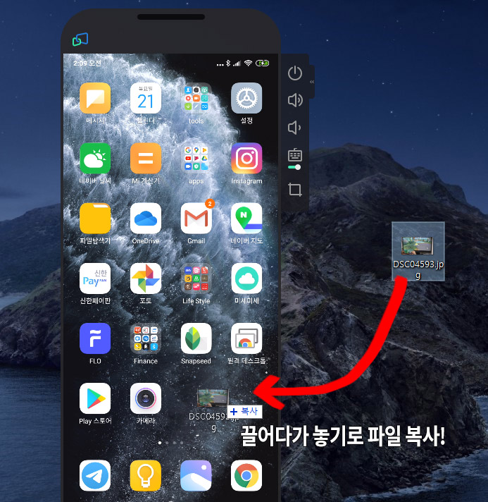 스샷 단축버튼, 볼륨 조절 버튼, 락 버튼 등도 사용할 수 있고, 심지어 컴퓨터에 있는 파일을 끌어다가 놓기로 스마트폰으로 복사하는 것도 가능합니다. 이렇게 복사한 파일은 루트폴더(sdcard)에 바로 저장이 되더군요 ^^