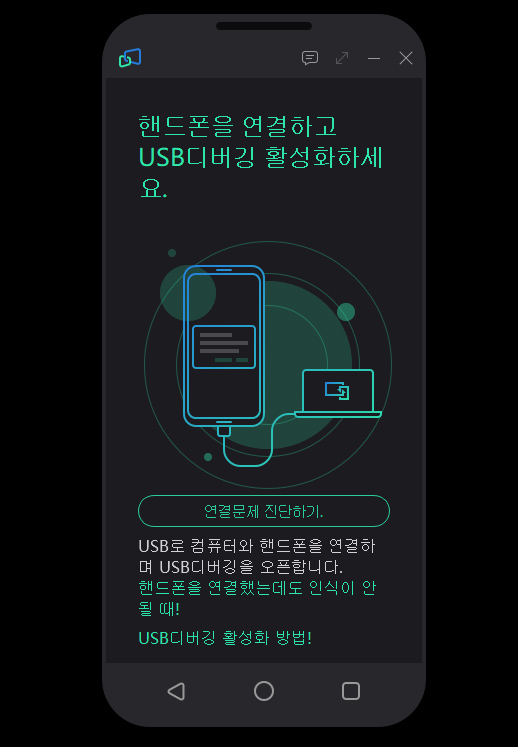 만약 첫 실행시 USB 디버깅 모드와 관련된 안내가 나온다면 안드로이드 스마트폰의 '개발자 모드(옵션)'에서 'USB 디버깅'기능을 활성화 하지 않았기 때문인데요.