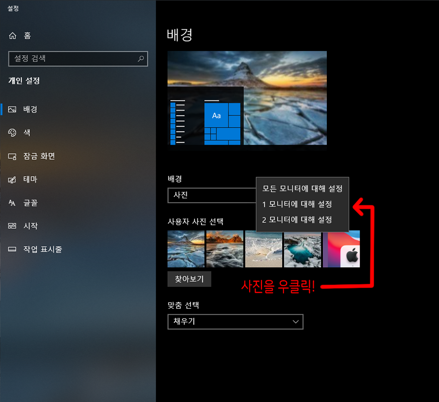 ๋ฐํํ๋ฉด์์ ์ฐํด๋ฆญ -> ๊ฐ์ธ์ค์ -> ์ฌ์ฉ์ ์ฌ์ง ์ ํ ์ด๋ฏธ์ง ์ธ๋ค์ผ์ ์ค๋ฅธ์ชฝ ๋ง์ฐ์ค ํด๋ฆญ์ผ๋ก ํ๋ฉด... 1 ๋ชจ๋ํฐ์ ๋ํด ์ค์ ํ ๊ฒ์ธ์ง, 2 ๋ชจ๋ํฐ์ ๋ํด ์ค์ ํ ๊ฒ์ธ์ง ์ต์ ์ด ๋์ค๊ฒ ๋ฉ๋๋ค. :)
