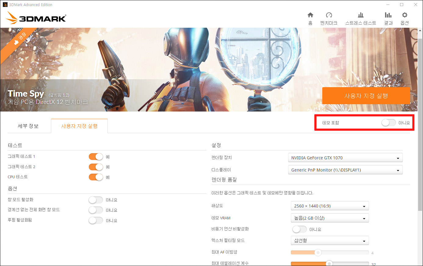 구입한 기념으로 타임스파이 부터 한번 돌려봤습니다. 참고로 3D Mark 정품 Advanced Edition을 구입하신 분들이라면 벤치마크 전에 설정에서 데모 포함 옵션을 끄고 실행하면 시간을 절약할 수 있습니다.