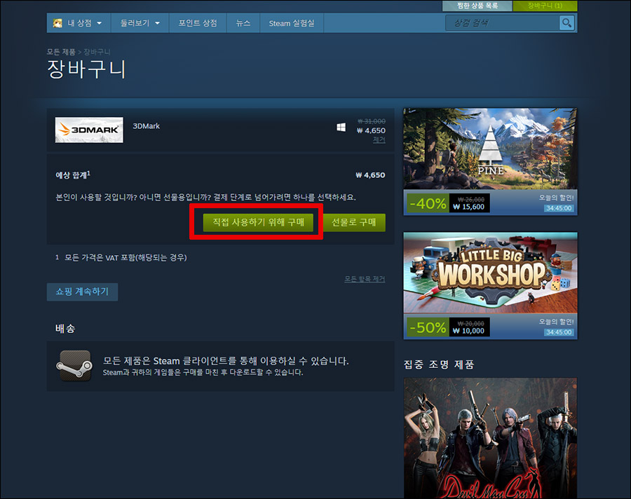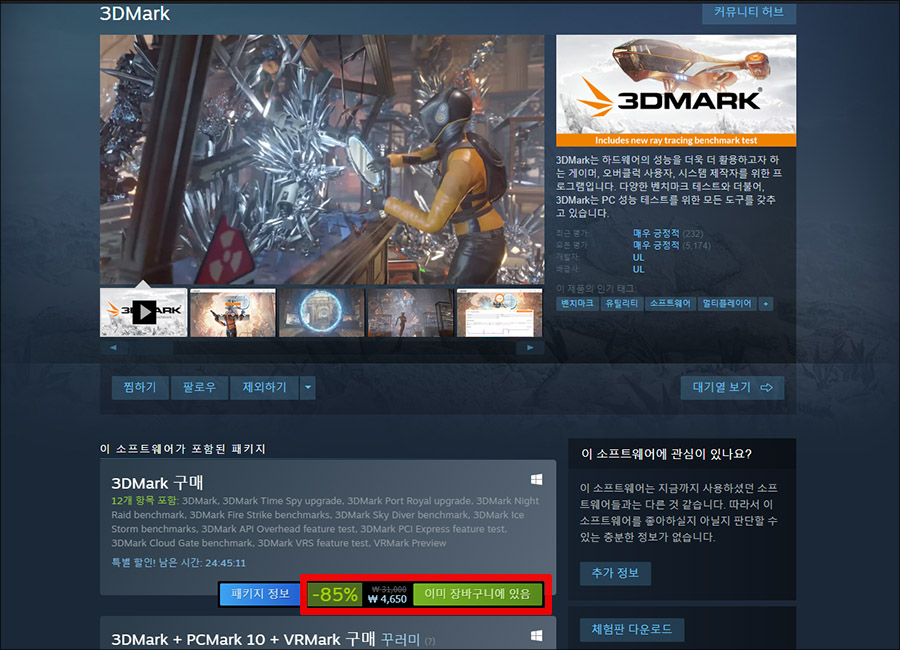 스팀에서 3D마크를 체험판으로 다운로드 하실 분들은 위에 링크를 통해 우측에 있는 '체험판 다운로드' 버튼을 클릭하면 되고, 저처럼 구입을 하실 분들이라면 되도록 할인을 하고 있는 시즌에 맞추어서 '장바구니에 추가' 버튼을 누른 뒤 아래처럼 결제를 완료하시면 됩니다.