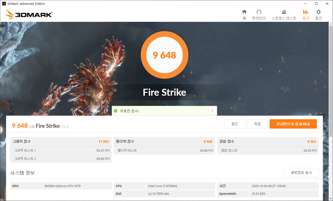 겜트북 지포스 GTX1070 + 인텔 i7-6800HK + 16GB 램 3D마크 벤치마크 점수