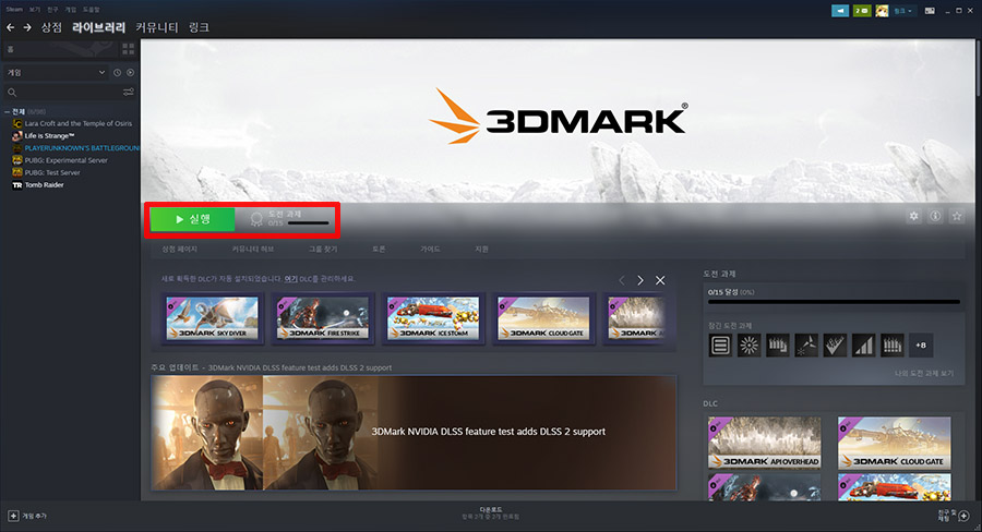 일단 3D마크도 스팀을 통해서 배포되는 '게임'이라서, 도전 과제가 있는 것을 확인할 수 있습니다. '실행'을 클릭하면...