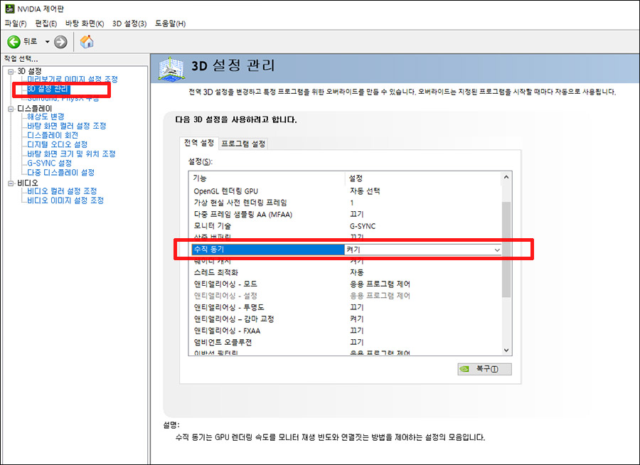 제 경우에는 처음 실행해보니 VSYNC를 꺼달라는 안내 문구가 나오더군요. 그래서 VSYNC(수직동기) 부분을 Nvidia 제어판 -> 3D 설정 관리에서 '끄기'로 변경한 뒤 재부팅을 했습니다.