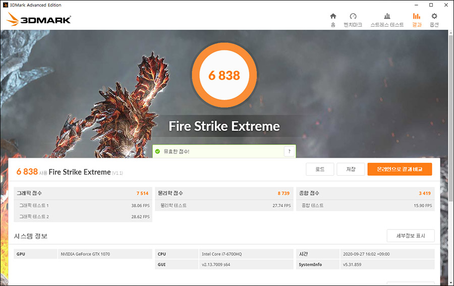 겜트북 지포스 GTX1070 + 인텔 i7-6800HK + 16GB 램 3D마크 벤치마크 점수