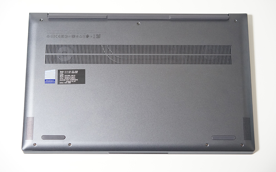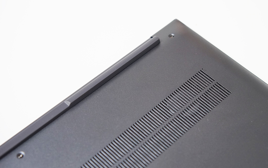아랫부분을 잘 살펴보면 뒷부분이 받침대 역할을 하듯 처리가 되어 있는 것을 알 수 있는데요. 덕분에 타이핑을 하기 딱 좋은 각이 완성이 되고, 공기 유입을 통한 공간이 마련되어 발열처리에도 장점을 가진 디자인입니다.