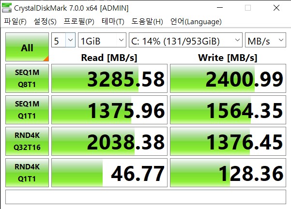 SSD 스토리지 속도 테스트 입니다. NVMe 방식이며, 최대읽기 속도 3200MB/s 대가 나오고... 쓰기 속도는 최대 2400MB/s대 입니다. 대부분의 최신 노트북이 체감속도가 매우 빠른 이유는 스토리지가 주역일 때가 많은데요. 슬슬 SSD도 1TB라는 대용량 시대가 열린 것 같다는 생각을 해보게 되네요.