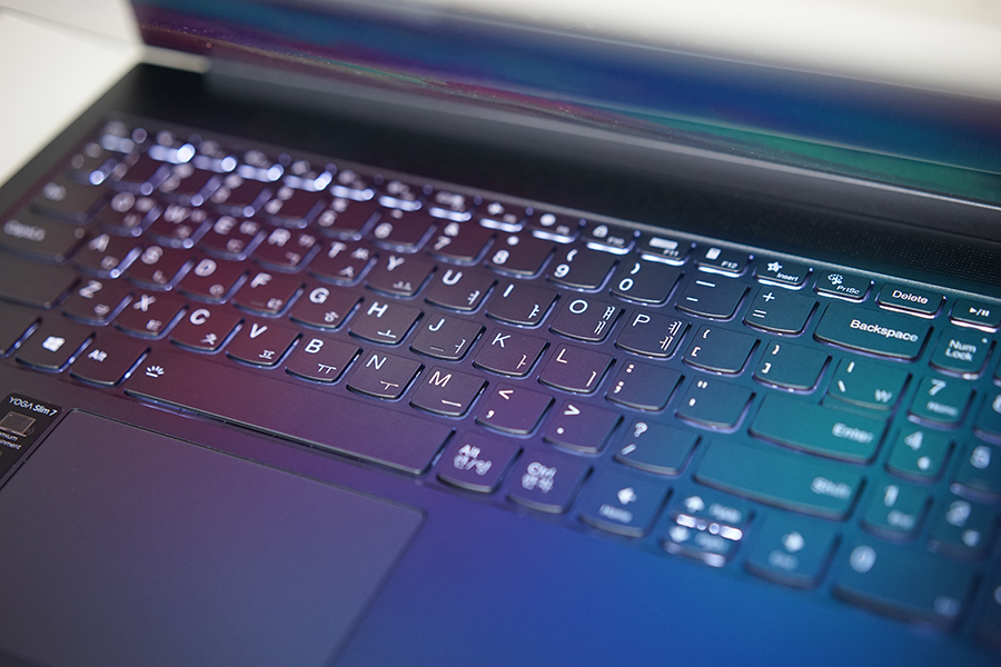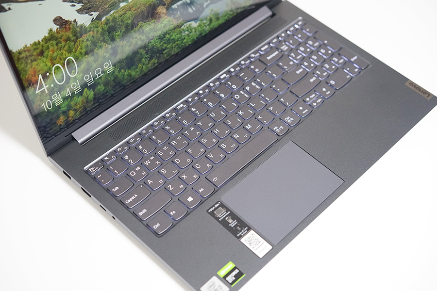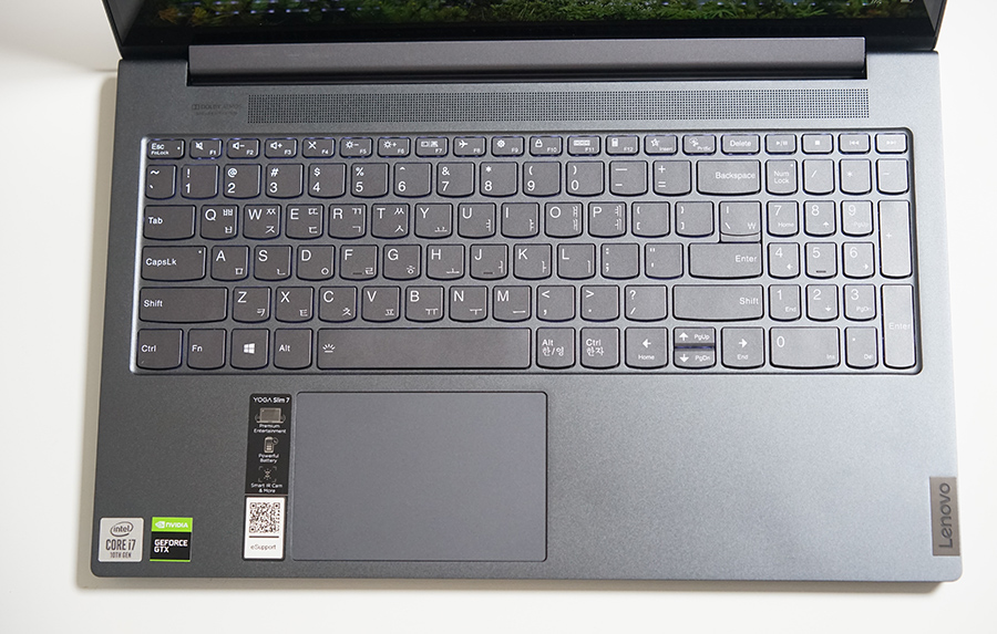 시야각에서 자유로운 IPS 스크린으로, sRGB 100% 색영역을 가지고 있습니다. 저는 2020년부터는 노트북을 선택할 때 디스플레이 패널을 선택하는 기준이 조금 까다로워졌는데요. 정확한 색표현과 화질을 기대할 수 있는 노트북의 기준점이 sRGB 100% 이라는 것을 기억하시면 좋을 것 같네요. 레노버 요가 슬림7 노트북은 얇은 베젤을 자랑하지만, 상단에는 IR 카메라도 탑재하고 있습니다.