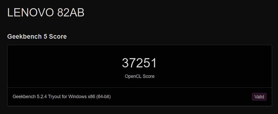 그래픽 성능을 가늠할 수 있는 OpenCL 점수믐 37251점입니다. 외장그래픽 지포스 GTX 1650을 탑재한만큼 높은 점수를 기록했습니다.